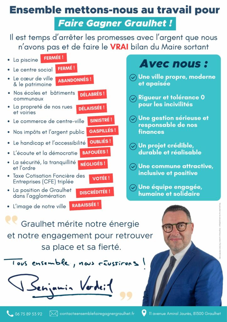 Notre priorité, c’est Graulhet ! Autour de Benjamin Verdeil, nous avons l’ambition collective d’offrir une autre voie, un autre choix aux graulhétoises et graulhétois lors des élections municipales des 15 et 22 mars 2026.