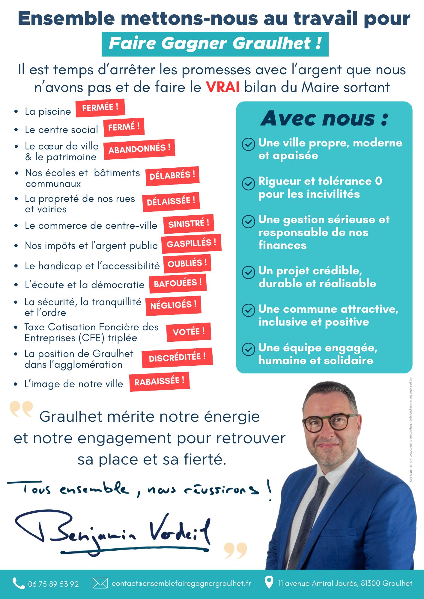 Surtout, sachez-le : votre avis compte et vous êtes également les bienvenus à notre atelier de campagne. Cette démarche locale et apolitique est ouverte à toutes celles et ceux qui souhaitent s’investir, pour qu’ensemble, nous fassions gagner Graulhet. Avec notre équipe unie et compétente nous sommes prêts à nous y engager !